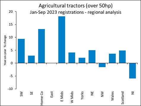 At regional level, registrations across the year to date were similar to or higher than in January to September 2022 in all parts of the country apart from North West England (-2%) and Northern Ireland (-6%). Growth was strongest in the East Midlands, where 18% more tractors were registered this year. The South of England also recorded faster year-on-year growth than the UK as a whole.